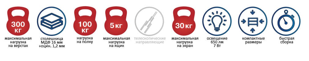 Верстак Garage Set 2Артикул: 35838Нет в наличии 17 200 Р 12 340 РЭкономия: 4 860 Р Верстак Garage Set 2 теперь в вашей корзине покупок ОписаниеХарактеристикиОтзывыДокументацияДоставкаОплатаОписаниеВерстак Garage Set 2 Предназначены для удобной организации рабочего места в гаражах, мастерских, в учебных заведениях, а за счет компактных размеров могут быть установлены на балконах, в бытовках. Нажмите, чтобы увеличить картинку Основные преимущества: Быстрая и легкая сборка. Весь комплект в одной коробке. Общая нагрузка на верстак до 300 кг. Размер упаковки В*Ш*Г, мм: 1140*560*140, вес 29 кг. Возможность установки дополнительных элементов. Столешница МДФ 16 мм покрытая листом оцинкованного металла 1.2 мм. Нагрузка на столешницу до 100 кг. Полка MS Standart 100x50 с шагом перестановки 50 мм. Нагрузка на полку до 100 кг. Четыре стойки MS Hard – сталь 1,5 мм, сечение 40х40 мм. Два ящика Garage с нагрузкой до 5 кг на ящик. Экран с перфорацией 10х10 мм, шаг 38 мм, сталь 0,8 мм. Нагрузка на экран до 30 кг. Светодиодное освещение. Мощность 7 Вт; световой поток - 650 лм; цветовая температура – белый 4200 К с козырьком. Комплект из трех аксессуаров (Держатель ключей WH, Держатель инструмента TH, Полка малая SSh). Комплектация Столешница МДФ - 1 шт. Полка MS Standart 100x50 - 1 шт. Стойка MS Hard - 4 шт. Ящик Garage - 2 шт. Экран - 1 шт. Светодиодное освещение - 1 шт. Держатель ключей WH - 1 шт. Держатель инструмента TH - 1 шт. Полка малая SSh - 1 шт. Дополнительные аксессуары на экран для инструментов: Помогают удобно организовать рабочее место Нажмите на картинку, чтобы посмотреть все дополнительные аксессуары на экранХарактеристики Внешние размеры (ВхШхГ)1500 × 1000 × 500 мм Макс. нагрузка на верстак, кг300 Макс. нагрузка на полку, кг100 Макс. нагрузка на ящик5 кг Высота рабочей поверхности, мм920 Ширина столешницы, мм1000 Глубина столешницы, мм500 Транспортные размеры (ВхШхГ)1140 × 560 × 140 мм Вес35 кг ПроизводительПРОМЕТ (Россия) Отзывы посетителей(0)Оставьте отзыв об этом товаре первым!ДокументацияДоставкаТранспортировка товара с Основного склада до адреса в Шатуре или ПВЗ (пункта выдачи заказов) осуществляется в течение 1-5 рабочих дней после оформления заказа и его оплаты. Варианты доставки: Доставка до адреса Самовывоз из ПВЗ (пункта выдачи заказов) Стоимость транспортировки зависит от заказа (объем, вес) — её можно уточнить у менеджера по тел.: Порядок получения заказаПри получении заказа рекомендуется распаковать товар и сверить с заказом. После получения и проверки заказа необходимо ознакомиться с документами и подписать их.После подписания акта приёма-передачи претензии по комплектации не принимаются. Доставка по всей РоссииМы можем отправить товар в любой город России транспортными компаниями. Склады расположены в 34 городах страны. Наши менеджеры могут подобрать самый оптимальный вариант доставки до Вашего города. Мы работаем с любыми транспортными компаниями, с которыми Вам удобнее работать. Наши менеджеры самостоятельно рассчитывают стоимость во многих крупных транспортных компаниях и предлагают клиентам более быстрый и недорогой способ доставки. Чаще всего отправка осуществляется транспортными компаниями ПЭК, Деловые линии, СДЭК. ОплатаВ интернет-магазине "Стальхаус" доступны несколько способов оплаты заказа. Для юридических лиц: Безналичная оплата по счёту без НДС Безналичная оплата по счёту с НДС (при этом стоимость не меняется) Безналичная опла